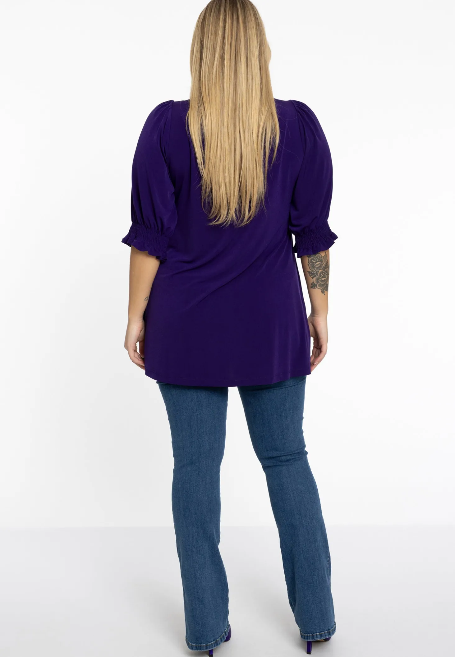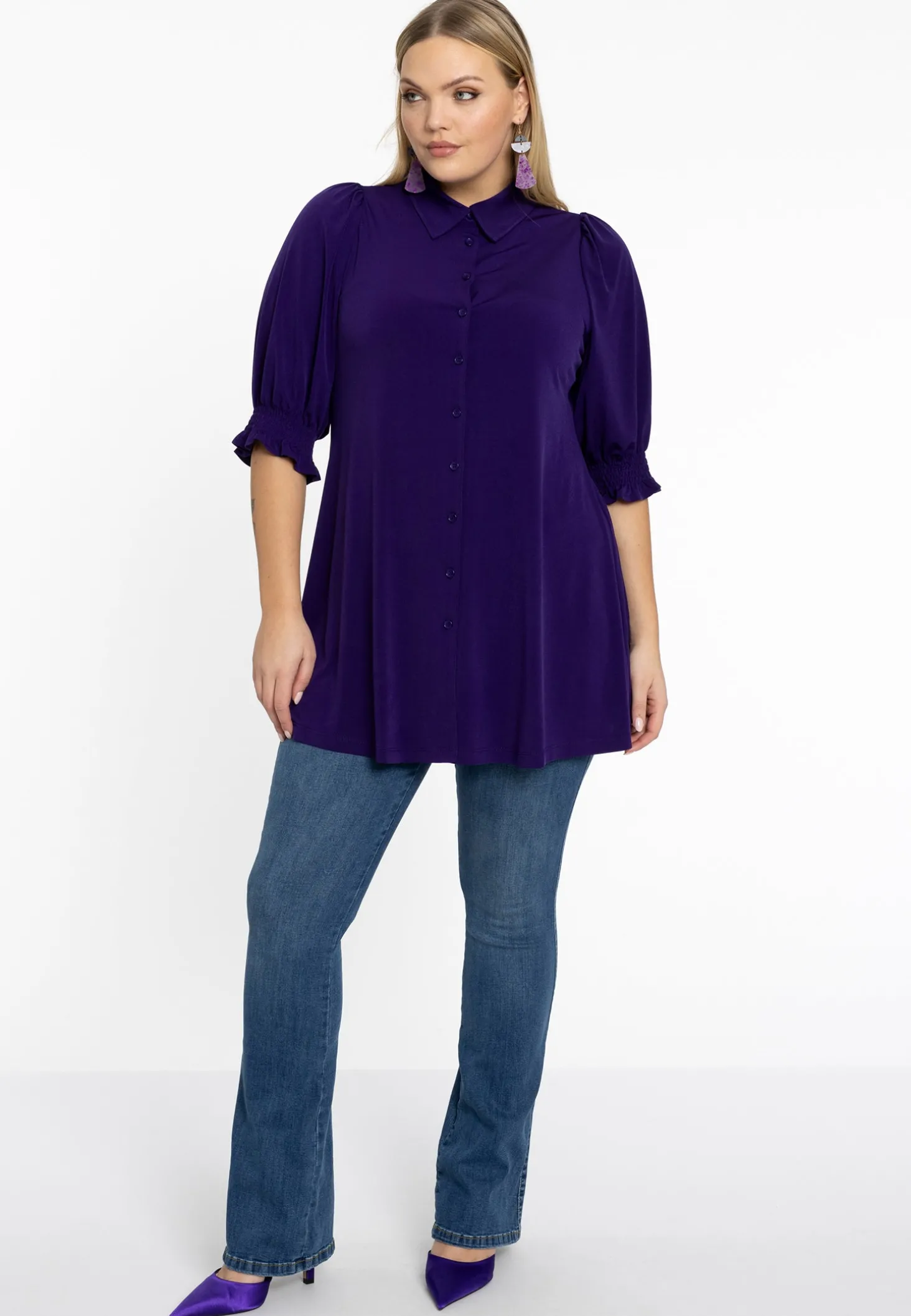 Blouse met pofmouwen en een rechte pasvorm. De blouse heeft een klassieke kraag met een geknoopte voorkant. Het is gemaakt van ons zachte dolce materiaal.