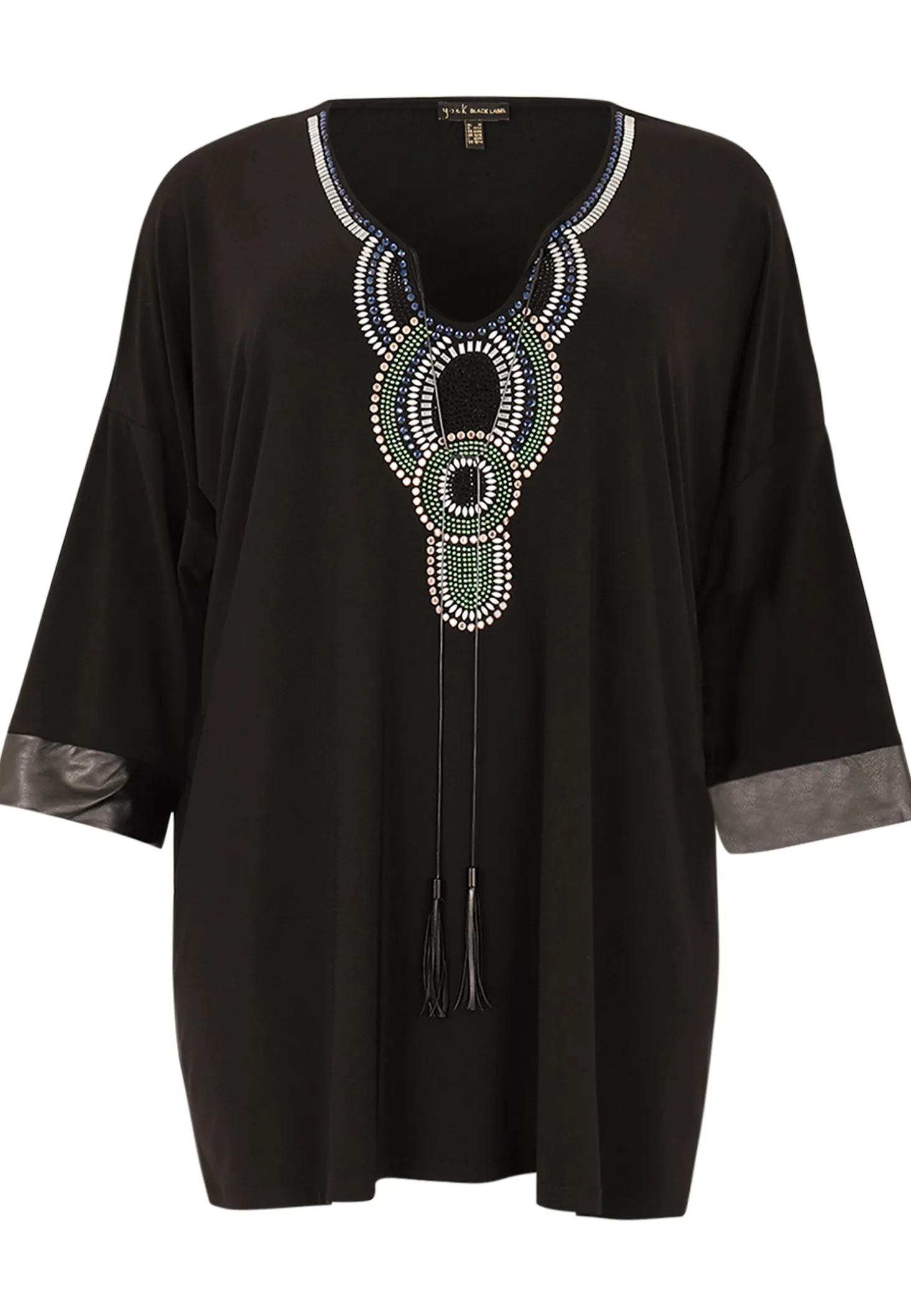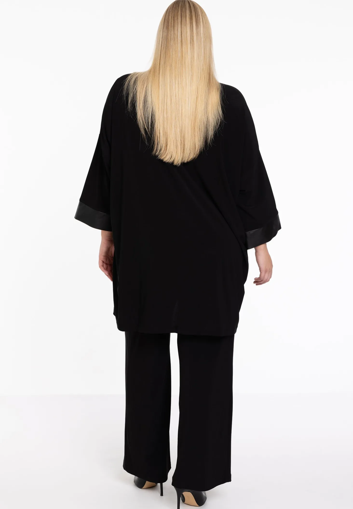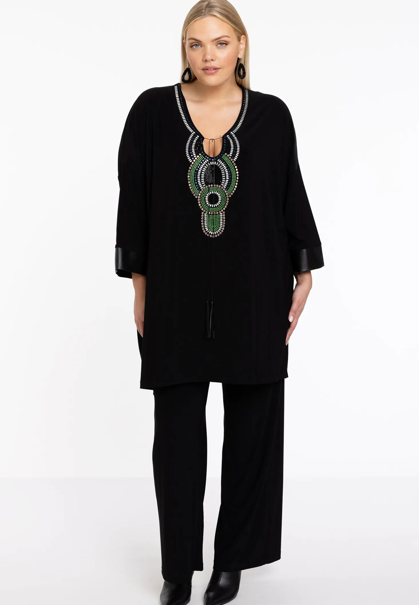 Wanneer de herfst begint hoef je niet meteen aan je winterse garderobe te beginnen! Dat bewijst deze sprankelende kaftan. Dit veelzijdige item is gemaakt van dolce materiaal en heeft faux-leren manchetten. De halslijn heeft de bekende kaftan vorm en is versierd met steentjes en kleine studs. Dit wijde item kan elk seizoen gedragen worden.