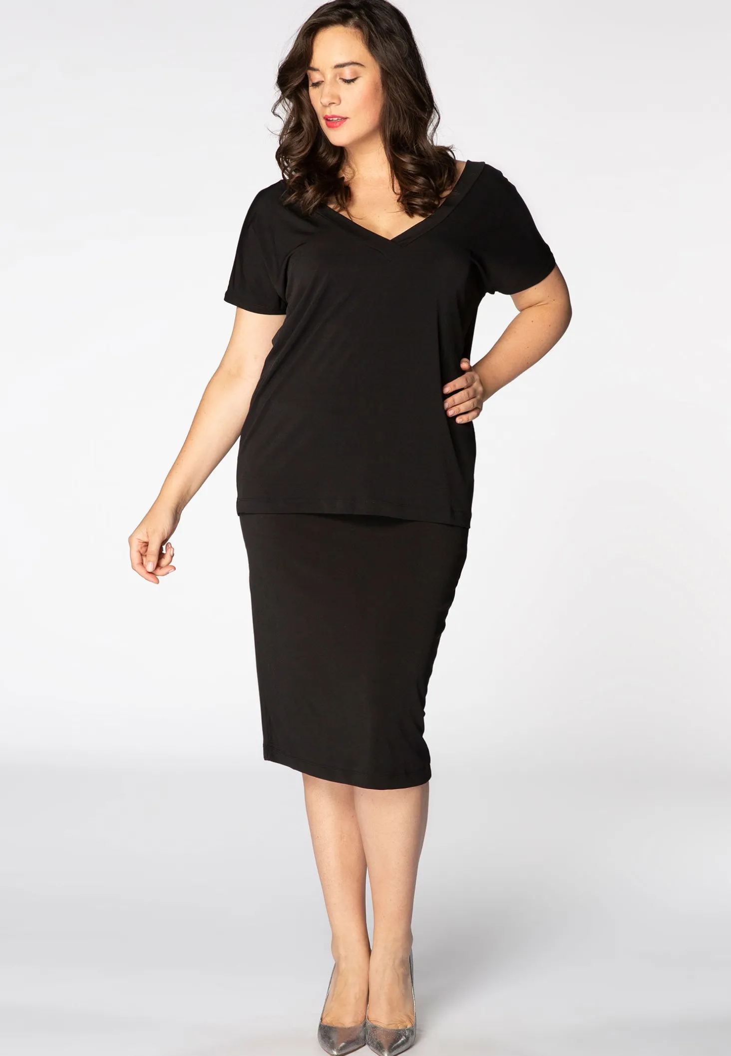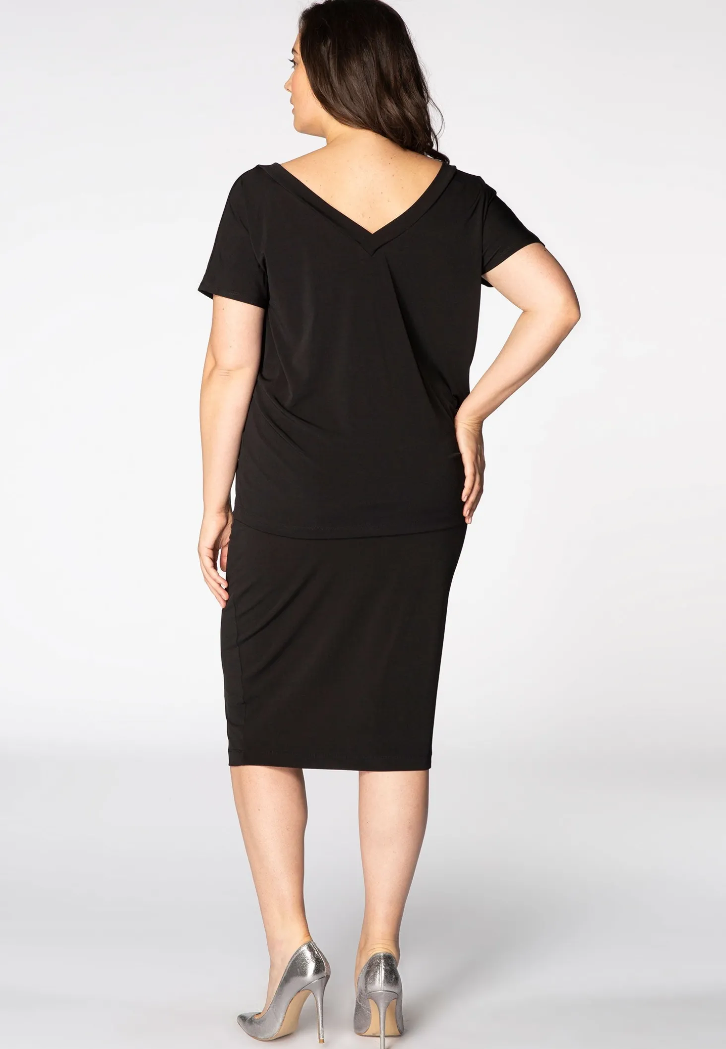 Een basisrok, eenvoudig te dragen met effen en geprinte tops. De rok heeft een prachtige lengte tot over de knie, voor een elegant silhouette.