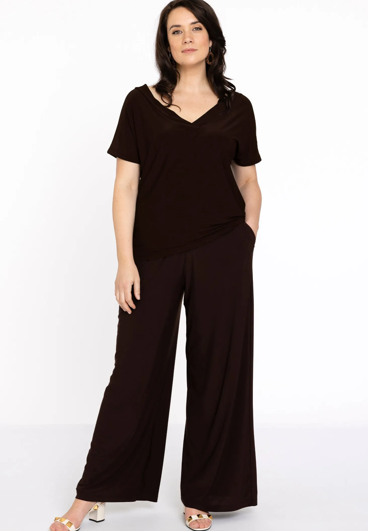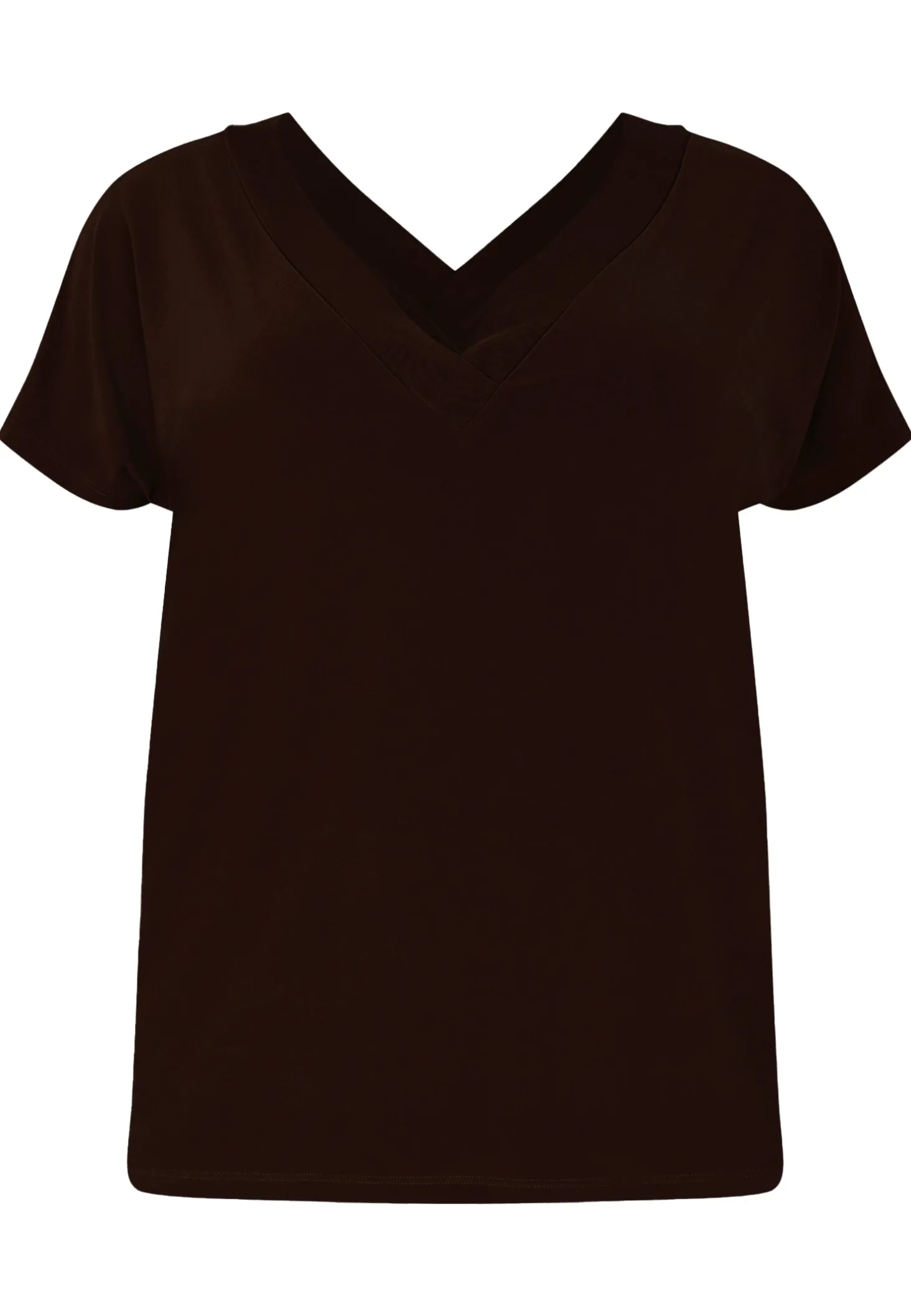 Een basic shirt met een V-hals aan de voor- en achterkant. Dit item kan makkelijk gecombineerd worden met iedere rok of broek.