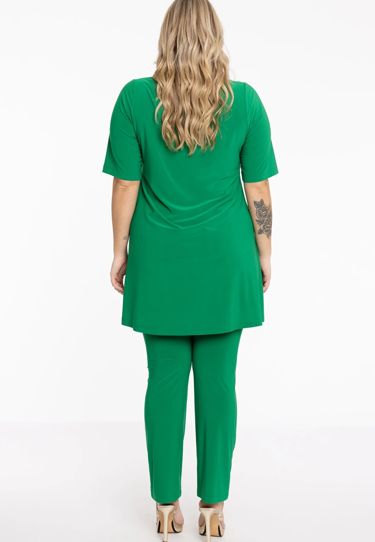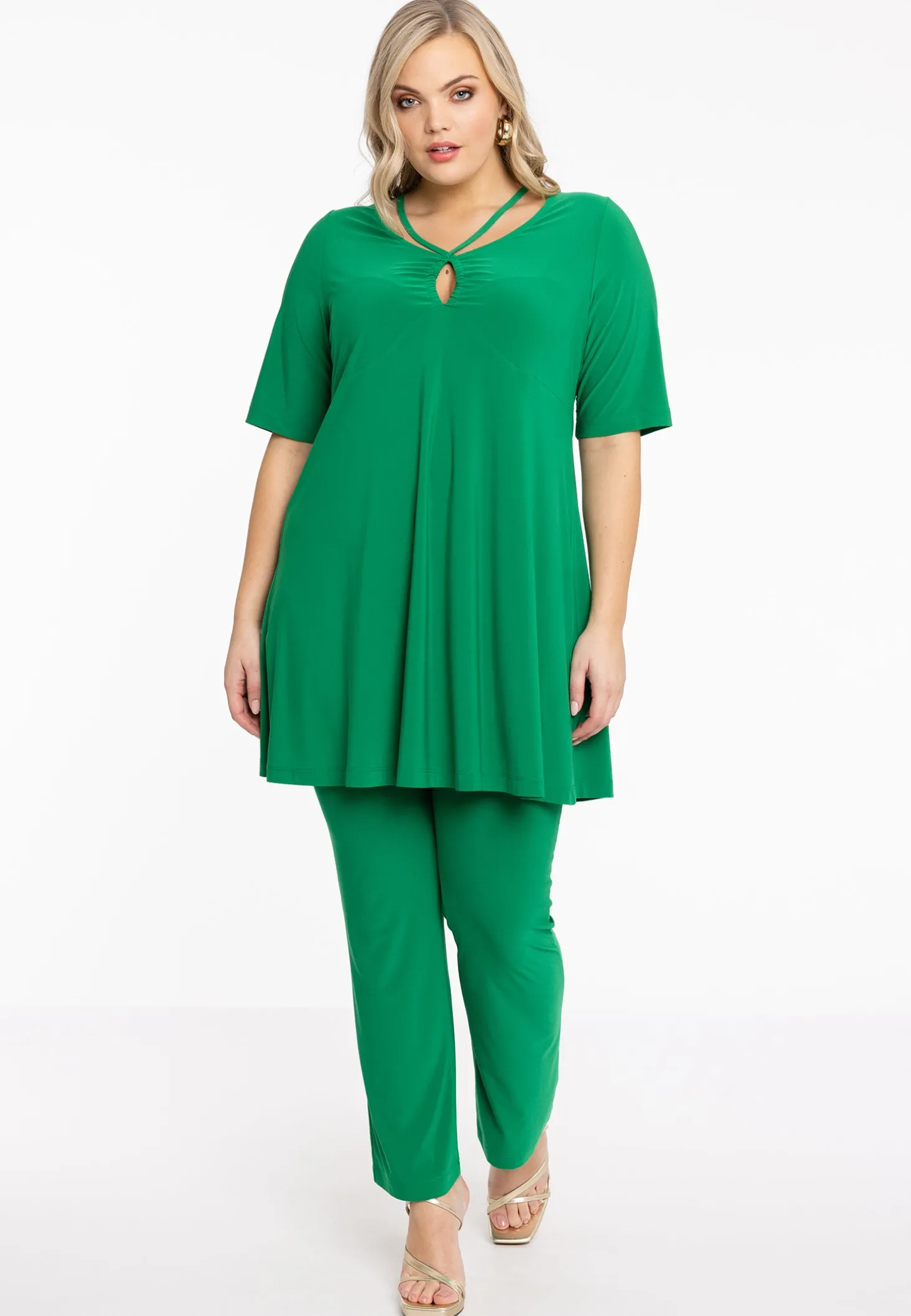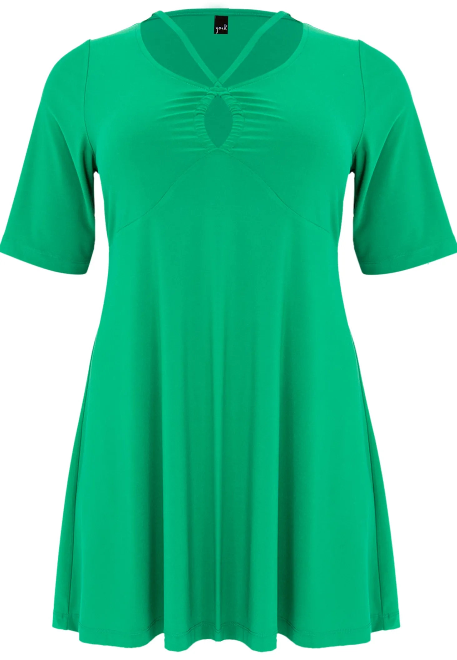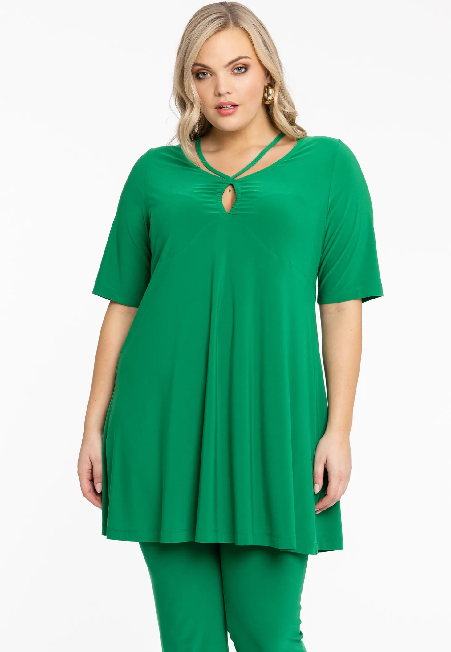 Zomerse tuniek met uitgesneden halslijn. De tuniek heeft korte mouwen, een wide bottom fit en is gemaakt van dolce materiaal.