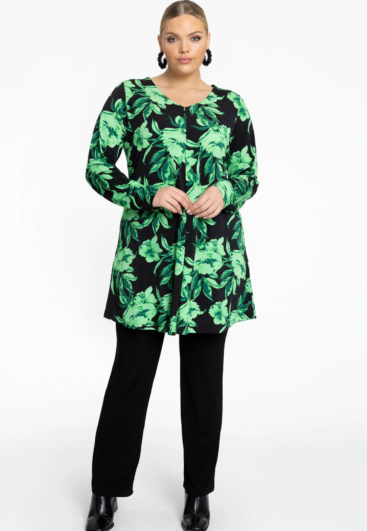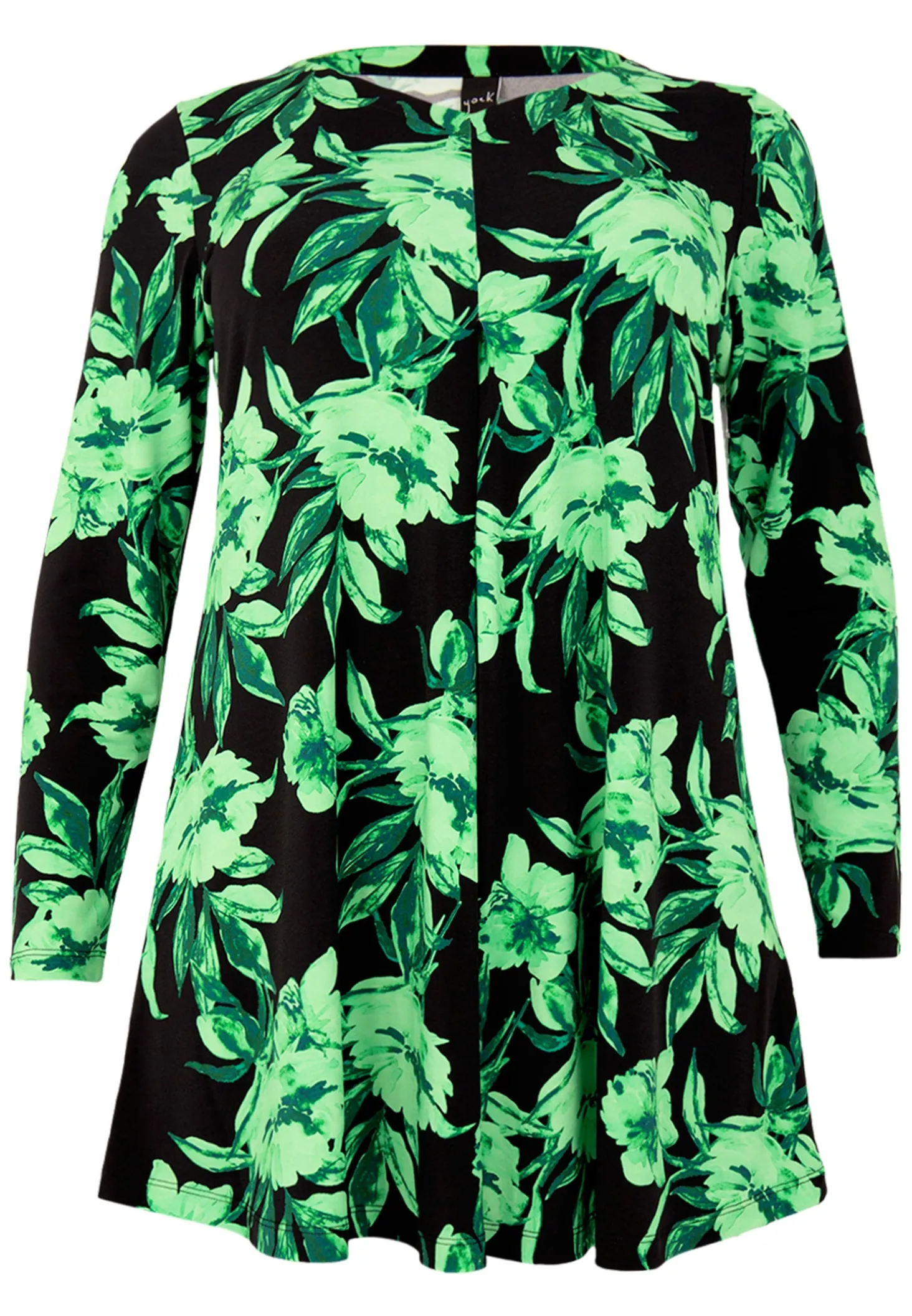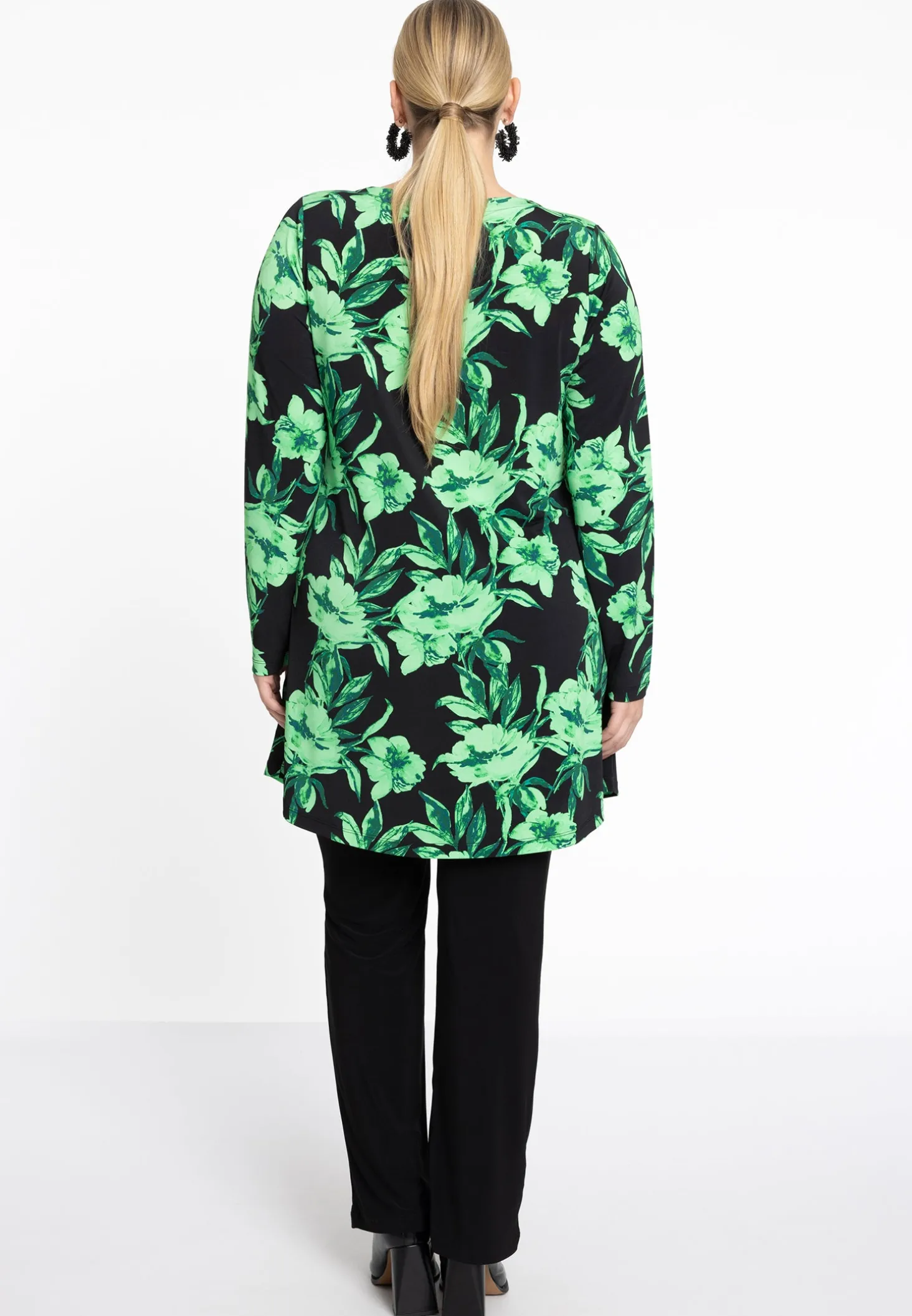 Deze tuniek is gemaakt van luxe Dolce-stof en heeft een opvallend groen bloemenpatroon op een zwarte achtergrond, perfect om een vleugje kleur aan je garderobe toe te voegen. De relaxte pasvorm en zachte, zijdeachtige textuur bieden de hele dag comfort, terwijl de lange mouwen en subtiele V-hals een vleugje elegantie toevoegen.