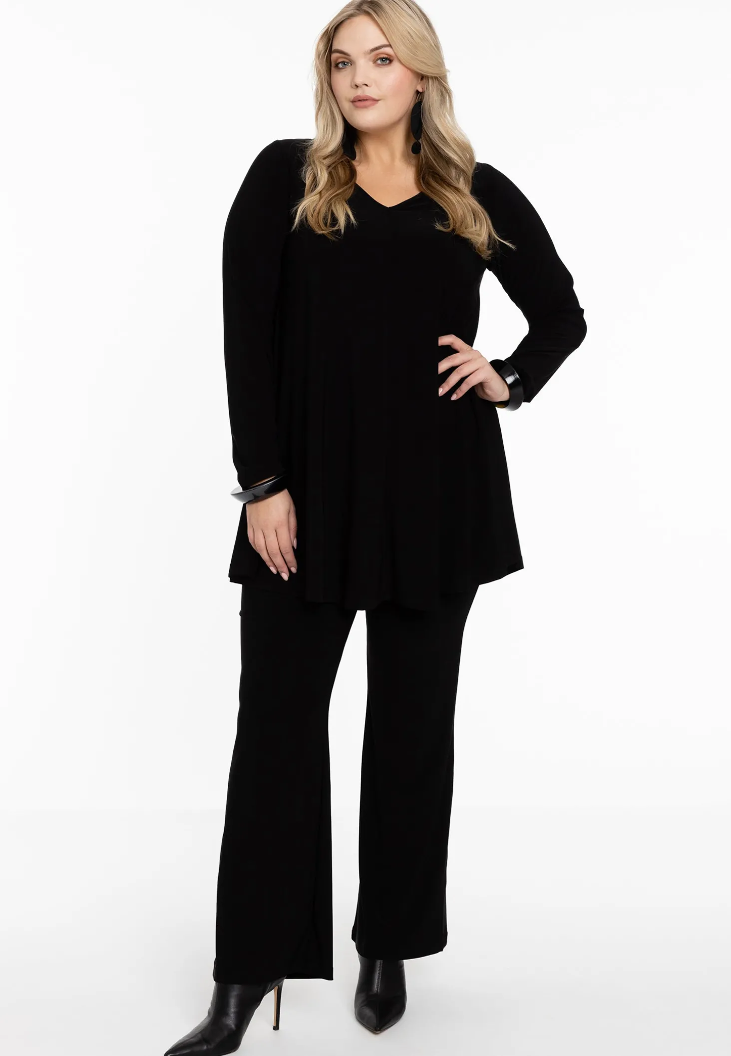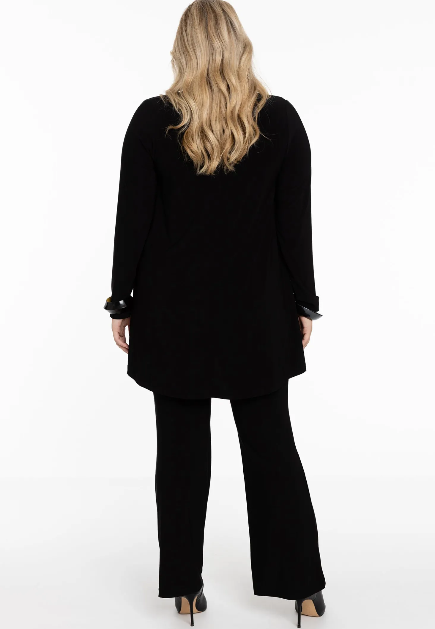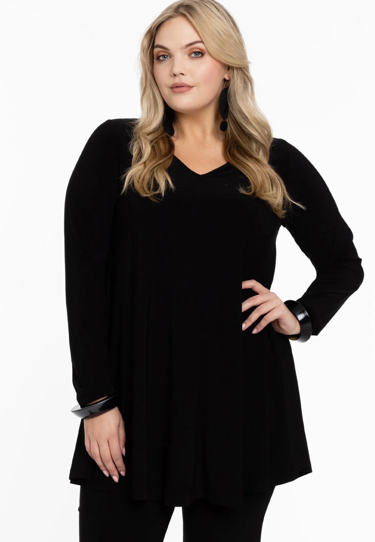 Een nieuwe toevoeging aan de basic Yoek collectie is de Swing pasvorm, welke aangesloten valt op de borst en een zeer wijde onderkant heeft. Deze tuniek in de nieuwe fit, heeft lange mouwen en een V-hals. Vervaardigd van het fijne dolce materiaal.