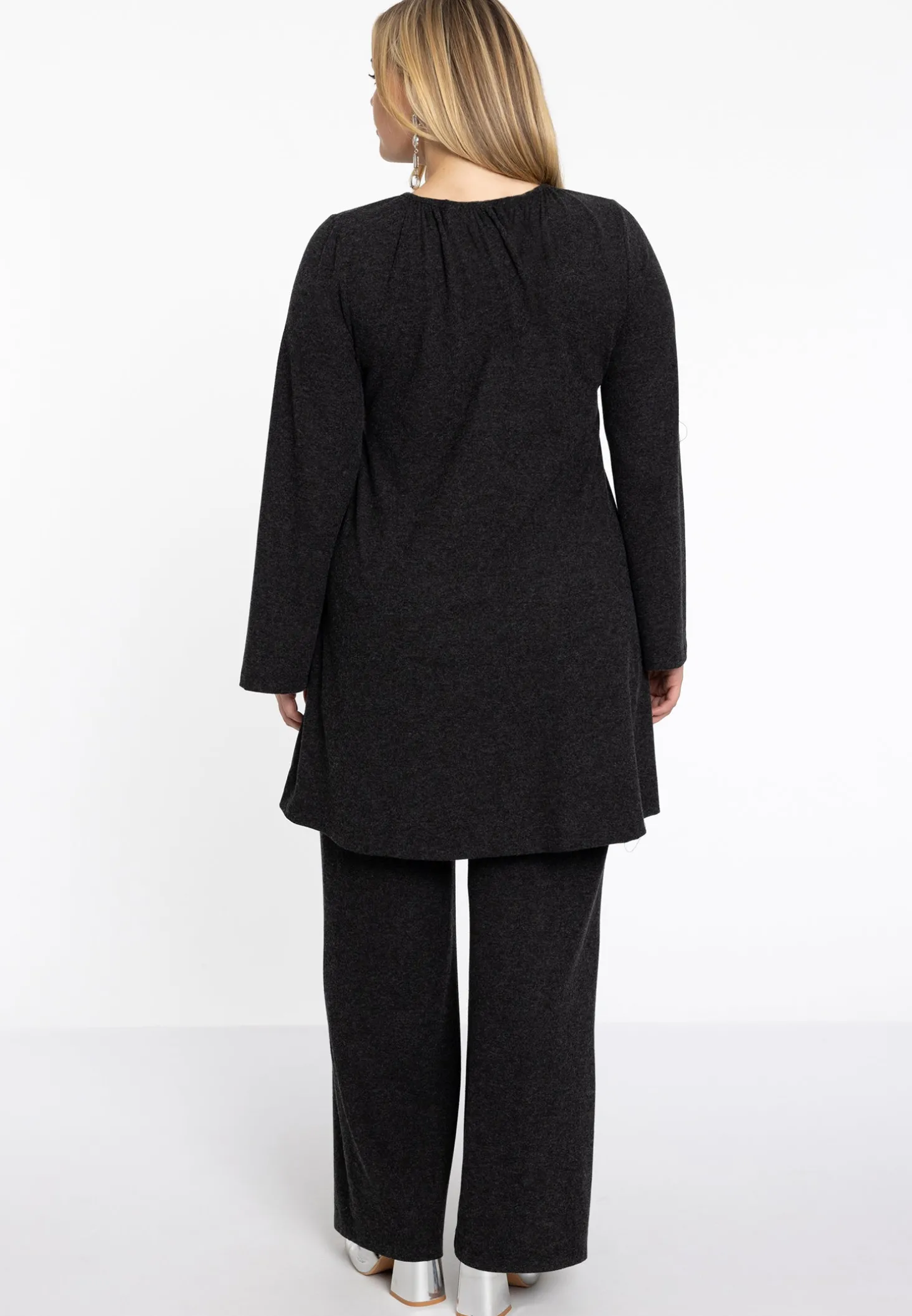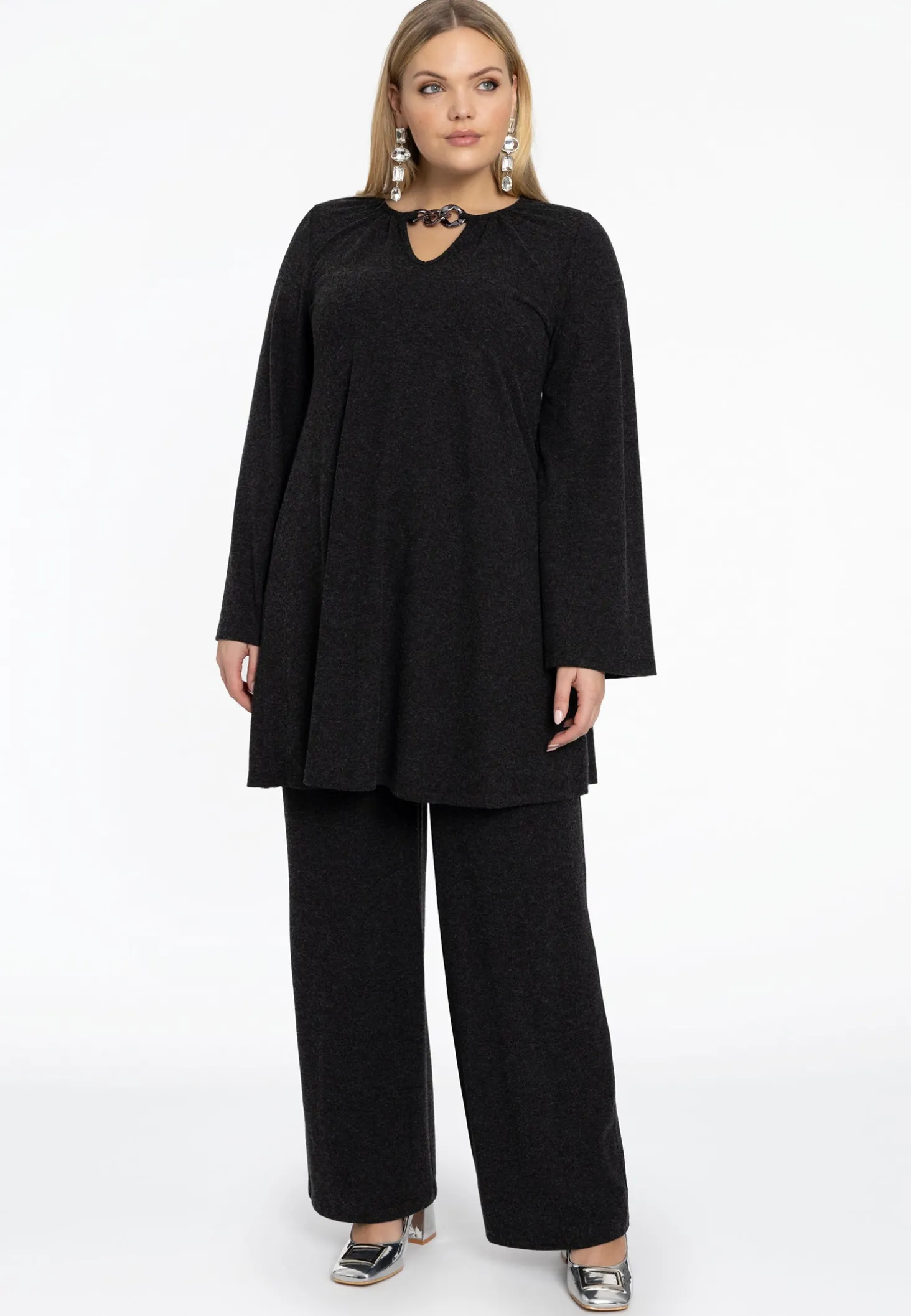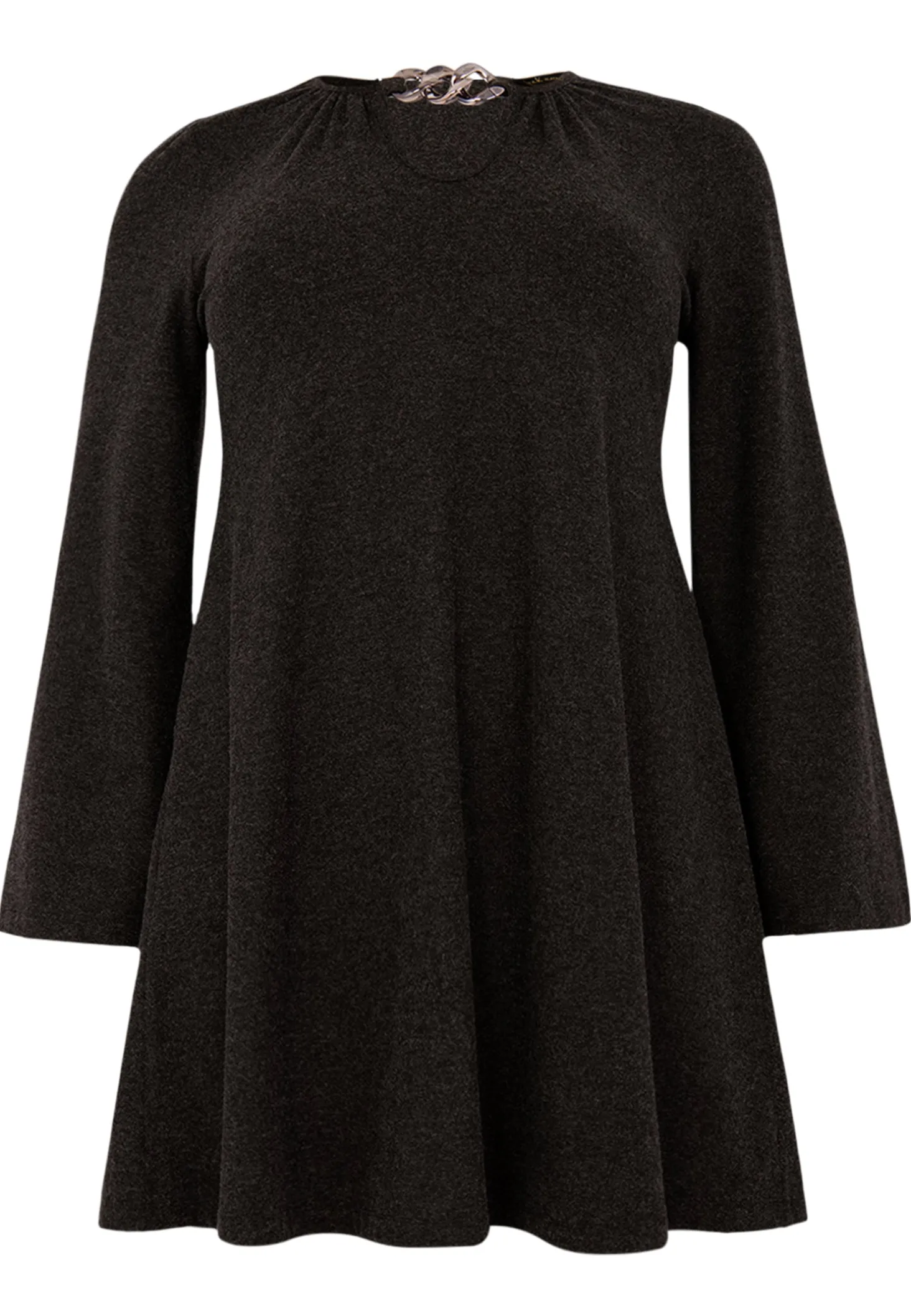 Een tuniek verfraaid met een opvallend kettingdetail, is letterlijk alles wat je nodig hebt om je outfit te laten opvallen! Deze wide bottom tuniek, gemaakt van comfortabel en zacht materiaal, heeft een uitgesneden halslijn en een opvallende ketting als detail. Afgewerkt met uitlopende mouwen.