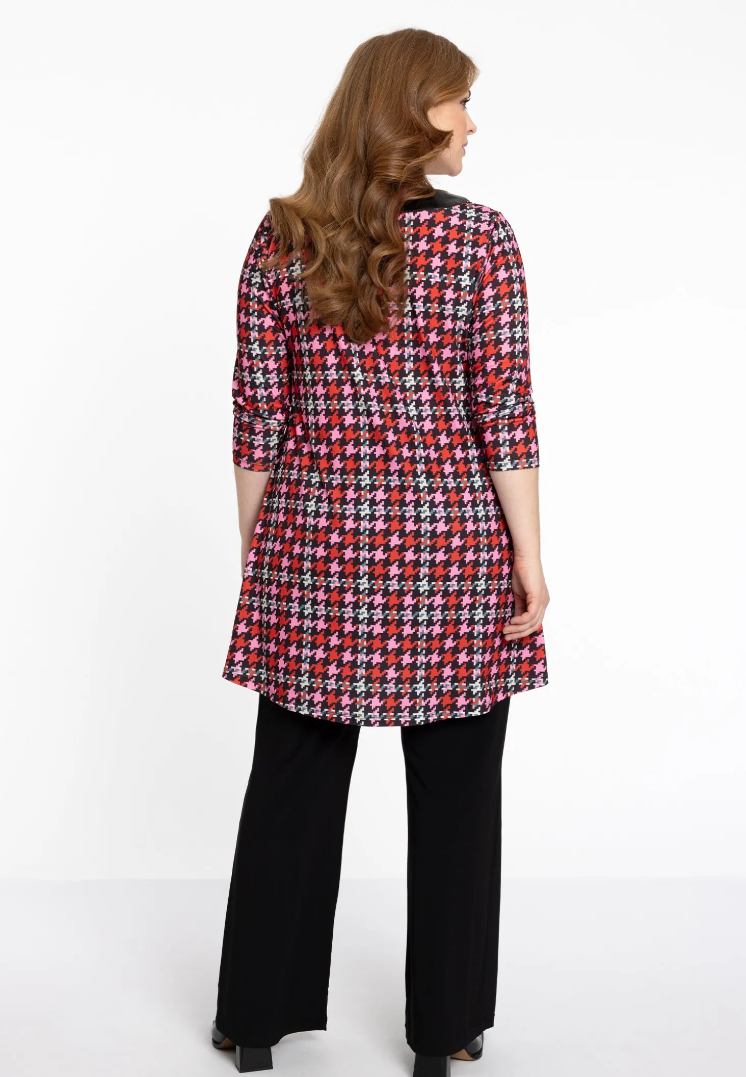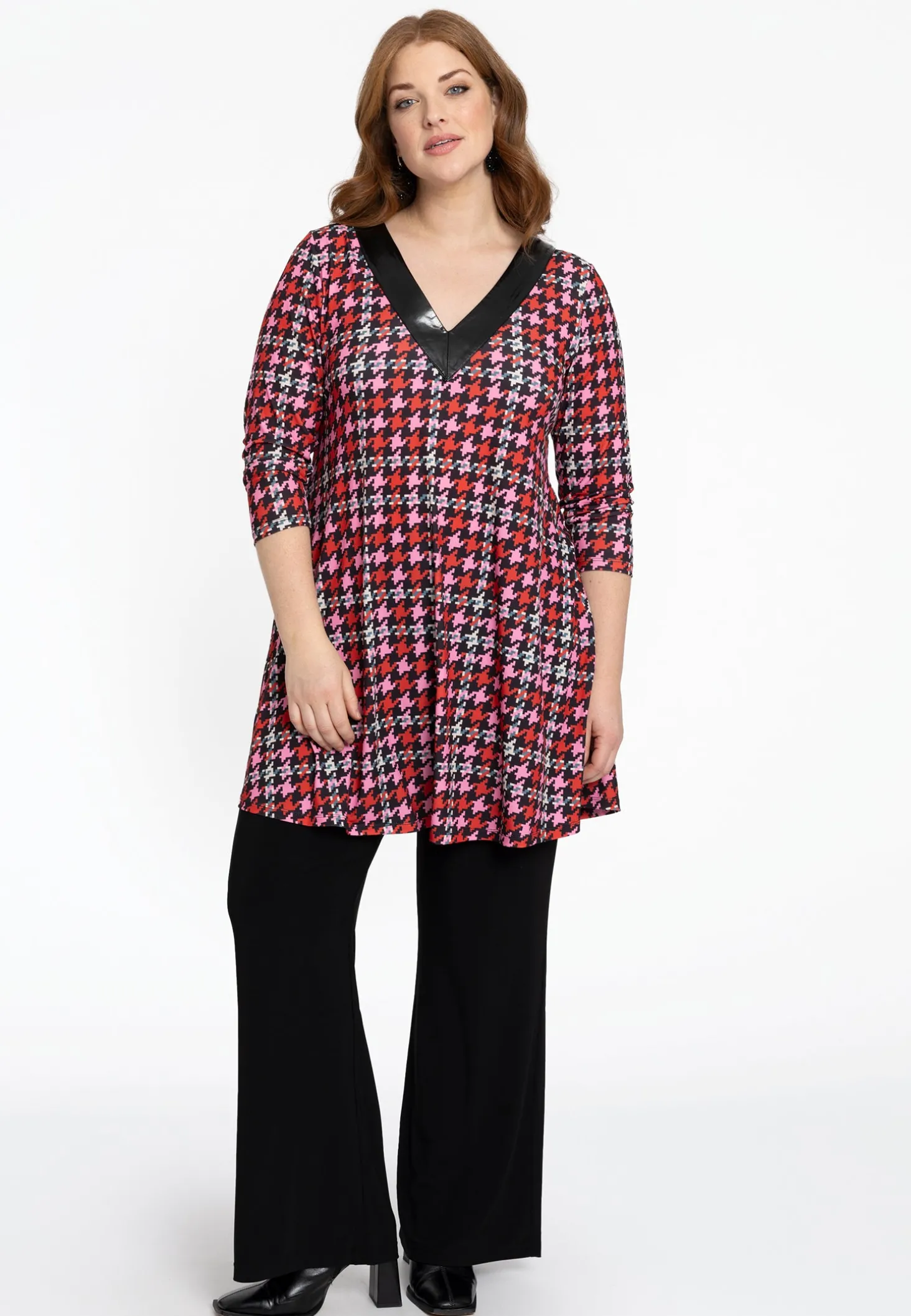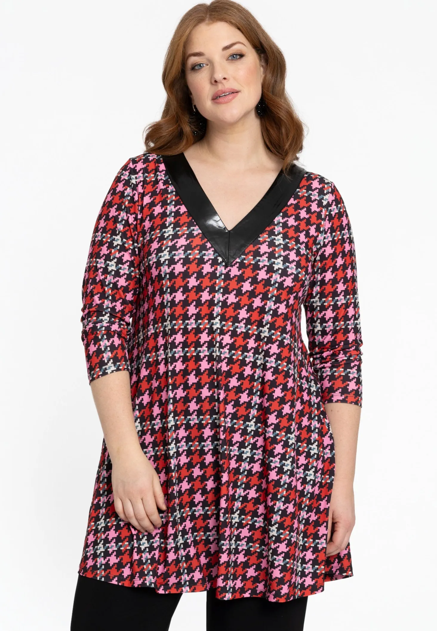 Omarm de perfecte mix van mode en comfort met deze opvallende tuniek, ontworpen om overal een krachtig statement te maken. Deze tuniek is gemaakt van premium dolce-stof en heeft een unieke textuur die de levendige rode en roze pied-de-poule-ruitprint benadrukt. De lange mouwen zorgen voor een vleugje elegantie, terwijl de zwarte kunstleren V-hals voor een verfijnd contrast zorgt.