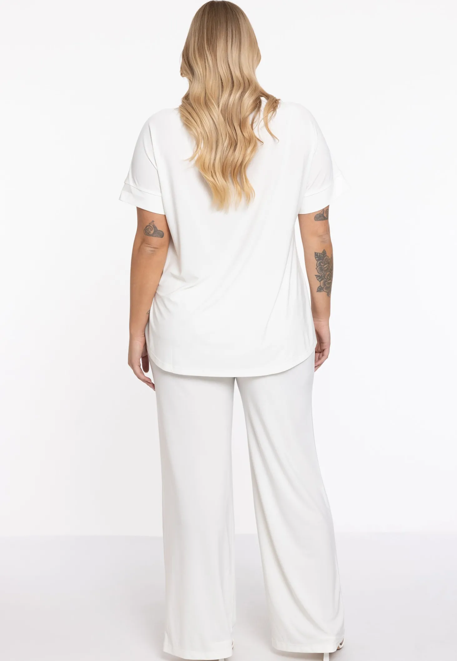 Een lange basic pantalon in onze soepele Dolce kwaliteit. De broek heeft een elastische tailleband.