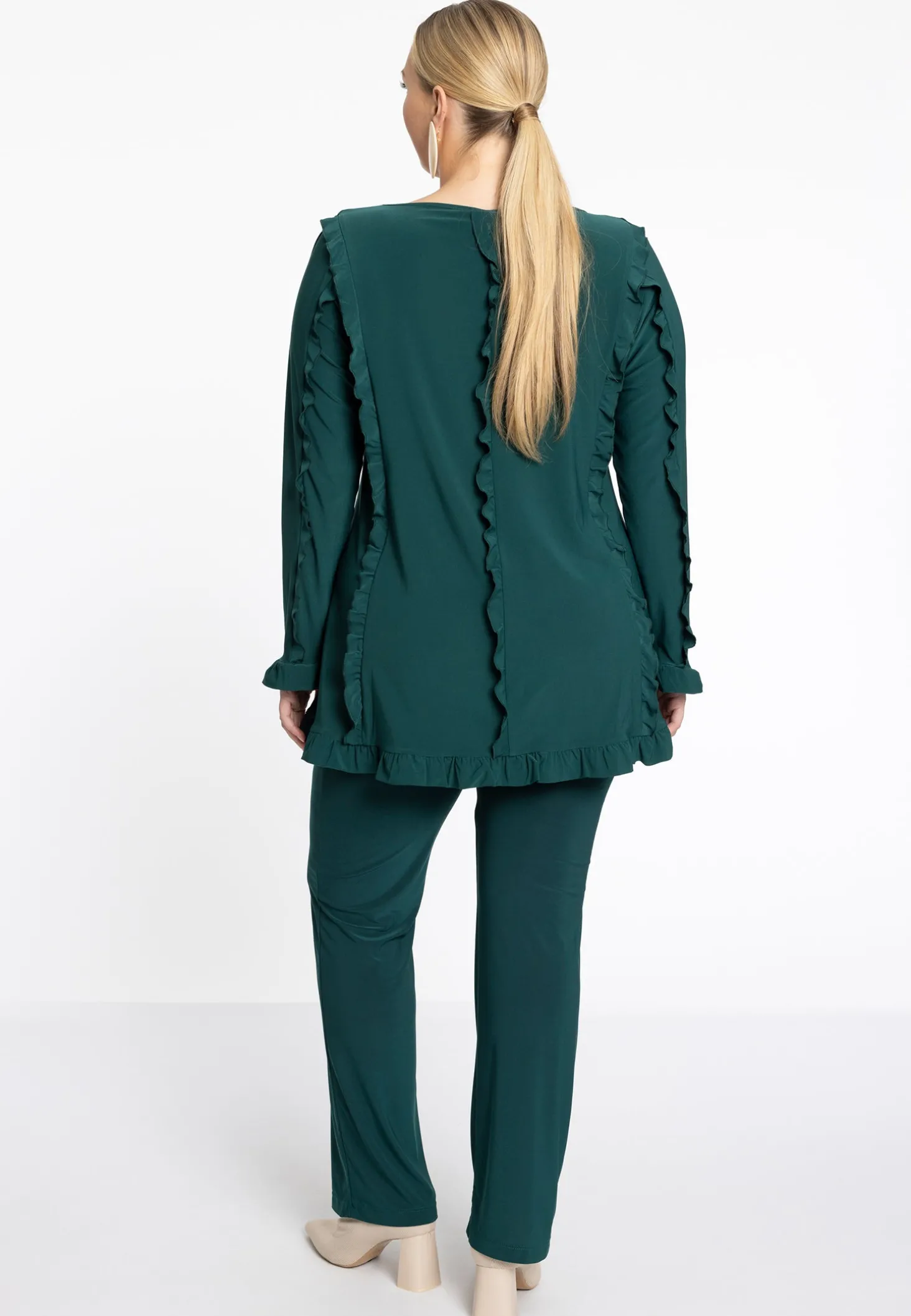 Maak kennis met een van onze populairste pasvormen met een gegolfde twist! Deze uitlopende tuniek is versierd met ruches van schouders tot zoom. Het heeft een ronde halslijn, lange mouwen en is gemaakt van dolce materiaal.